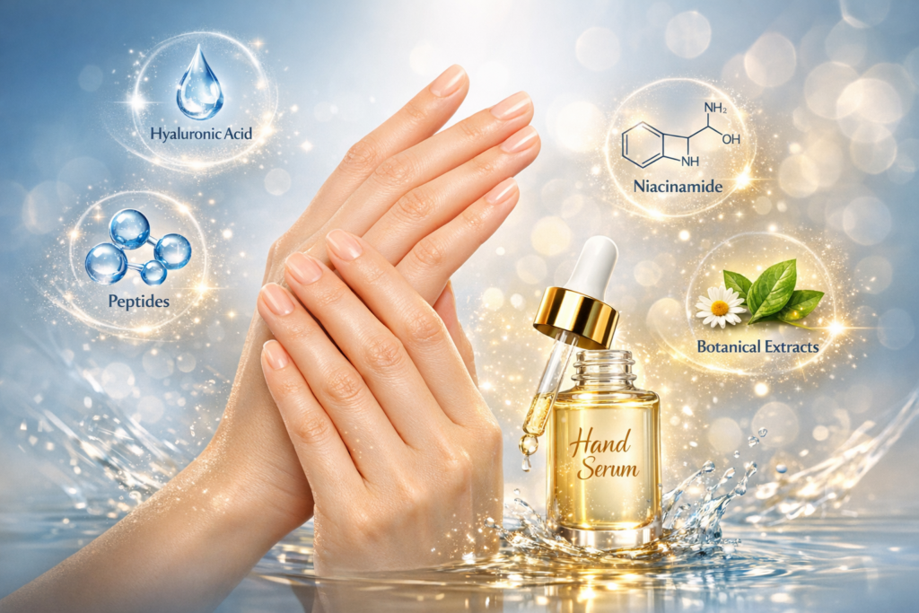 手肌専用美容液による“深層ケア”が欠かせません。ハンドクリームは表面の保湿が中心ですが、美容液は肌の奥まで浸透し、修復を促す成分が配合されています。ナイアシンアミドはくすみをケアし、ヒアルロン酸は深層保湿を、ペプチドは肌の再生をサポートし、パンテノール(ビタミンB5)は炎症を鎮め、植物エキスは抗酸化作用で環境ストレスから守ってくれます。美容液とクリームを併用することで、ケア効果が格段にアップします。